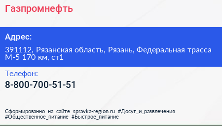 Газпромнефть по адресу 391112, Рязанская область, Рязань, Федеральная трасса М-5 170 км, ст1 в дальнейшем Организация, размещена в следующих категориях: