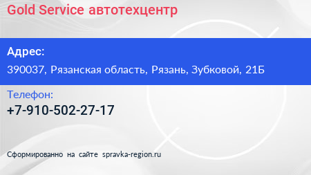 Gold Service, автотехцентр по адресу 390037, Рязанская область, Рязань, Зубковой, 21Б в дальнейшем Организация, размещена в следующих категориях: