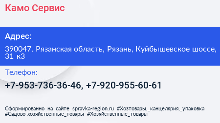 Камо Сервис по адресу 390047, Рязанская область, Рязань, Куйбышевское шоссе, 31 к3 в дальнейшем Организация, размещена в следующих категориях:
