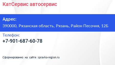 КатСервис, автосервис по адресу 390000, Рязанская область, Рязань, Район Песочня, 12Б в дальнейшем Организация, размещена в следующих категориях: