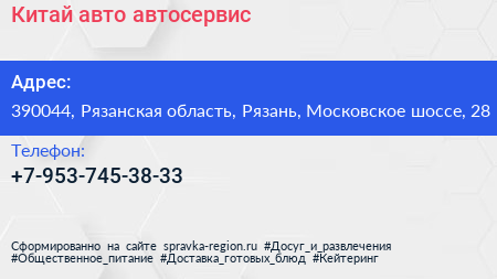 Китай-авто, автосервис по адресу 390044, Рязанская область, Рязань, Московское шоссе, 28 в дальнейшем Организация, размещена в следующих категориях: