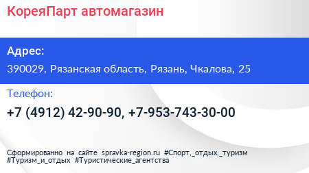 КореяПарт, автомагазин по адресу 390029, Рязанская область, Рязань, Чкалова, 25 в дальнейшем Организация, размещена в следующих категориях:
