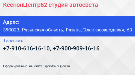 КсенонЦентр62, студия автосвета по адресу 390023, Рязанская область, Рязань, Электрозаводская, 63 в дальнейшем Организация, размещена в следующих категориях: