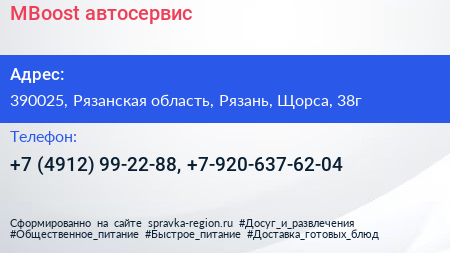 MBoost, автосервис по адресу 390025, Рязанская область, Рязань, Щорса, 38г в дальнейшем Организация, размещена в следующих категориях: