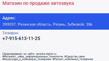 Магазин по продаже автозвука по адресу 390037, Рязанская область, Рязань, Зубковой, 18в в дальнейшем Организация, размещена в следующих категориях: