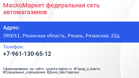 МаслоМаркет, федеральная сеть автомагазинов по адресу 390011, Рязанская область, Рязань, Рязанская, 22д в дальнейшем Организация, размещена в следующих категориях:
