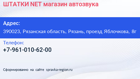 ШТАТКИ.NET, магазин автозвука по адресу 390023, Рязанская область, Рязань, проезд Яблочкова, 8г в дальнейшем Организация, размещена в следующих категориях: