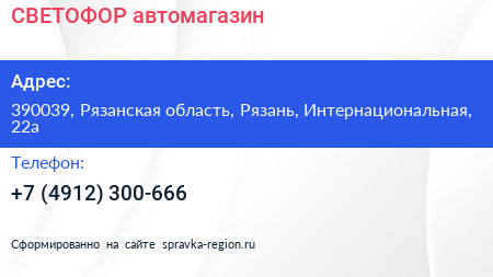 СВЕТОФОР, автомагазин по адресу 390039, Рязанская область, Рязань, Интернациональная, 22а в дальнейшем Организация, размещена в следующих категориях: