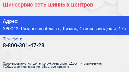 Шинсервис, сеть шинных центров по адресу 390042, Рязанская область, Рязань, Станкозаводская, 17а в дальнейшем Организация, размещена в следующих категориях: