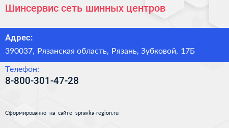 Шинсервис, сеть шинных центров по адресу 390037, Рязанская область, Рязань, Зубковой, 17Б в дальнейшем Организация, размещена в следующих категориях: