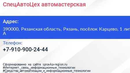 СпецАвтоЦех, автомастерская по адресу 390000, Рязанская область, Рязань, посёлок Карцево, 1 лит А в дальнейшем Организация, размещена в следующих категориях: