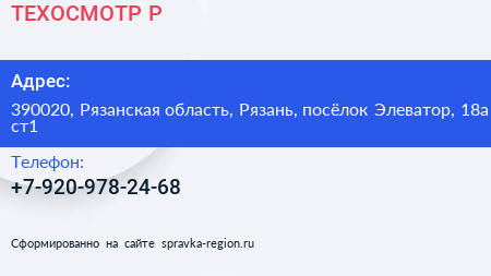 ТЕХОСМОТР-Р по адресу 390020, Рязанская область, Рязань, посёлок Элеватор, 18а ст1 в дальнейшем Организация, размещена в следующих категориях: