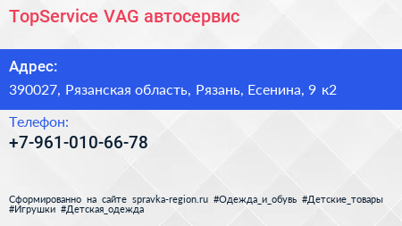 TopService VAG, автосервис по адресу 390027, Рязанская область, Рязань, Есенина, 9 к2 в дальнейшем Организация, размещена в следующих категориях: