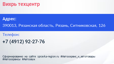 Вихрь, техцентр по адресу 390013, Рязанская область, Рязань, Ситниковская, 126 в дальнейшем Организация, размещена в следующих категориях: