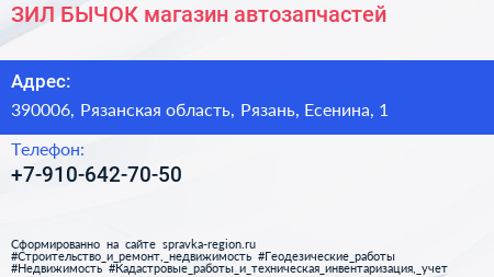 ЗИЛ-БЫЧОК, магазин автозапчастей по адресу 390006, Рязанская область, Рязань, Есенина, 1 в дальнейшем Организация, размещена в следующих категориях: