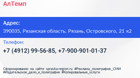 АлТемп по адресу 390035, Рязанская область, Рязань, Островского, 21 к2 в дальнейшем Организация, размещена в следующих категориях: