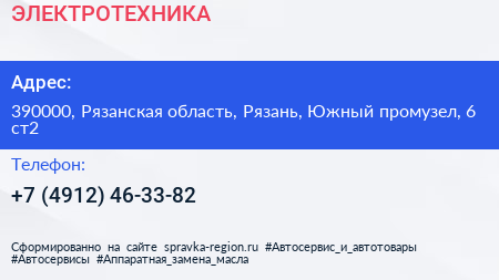 ЭЛЕКТРОТЕХНИКА по адресу 390000, Рязанская область, Рязань, Южный промузел, 6 ст2 в дальнейшем Организация, размещена в следующих категориях: