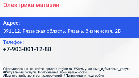 Электрика, магазин по адресу 391112, Рязанская область, Рязань, Знаменская, 2Б в дальнейшем Организация, размещена в следующих категориях: