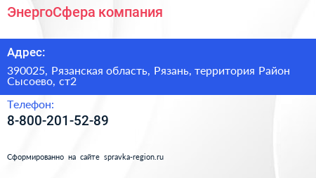 ЭнергоСфера, компания по адресу 390025, Рязанская область, Рязань, территория Район Сысоево, ст2 в дальнейшем Организация, размещена в следующих категориях: