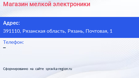 Магазин мелкой электроники по адресу 391110, Рязанская область, Рязань, Почтовая, 1 в дальнейшем Организация, размещена в следующих категориях: