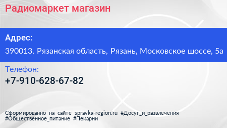 Радиомаркет, магазин по адресу 390013, Рязанская область, Рязань, Московское шоссе, 5а в дальнейшем Организация, размещена в следующих категориях: