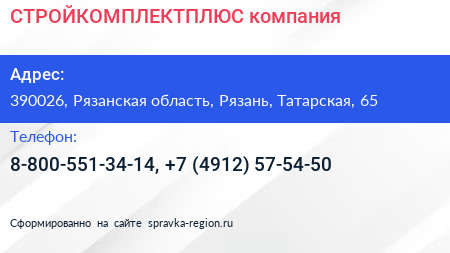 СТРОЙКОМПЛЕКТПЛЮС, компания по адресу 390026, Рязанская область, Рязань, Татарская, 65 в дальнейшем Организация, размещена в следующих категориях: