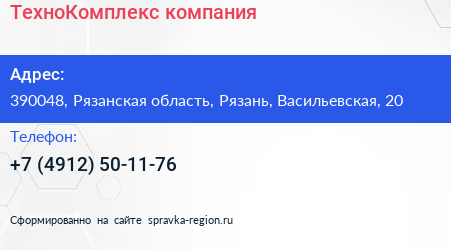 ТехноКомплекс, компания по адресу 390048, Рязанская область, Рязань, Васильевская, 20 в дальнейшем Организация, размещена в следующих категориях: