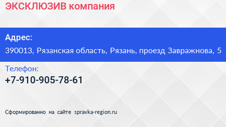 ЭКСКЛЮЗИВ, компания по адресу 390013, Рязанская область, Рязань, проезд Завражнова, 5 в дальнейшем Организация, размещена в следующих категориях: