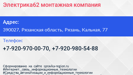 Электрика62, монтажная компания по адресу 390027, Рязанская область, Рязань, Кальная, 77 в дальнейшем Организация, размещена в следующих категориях: