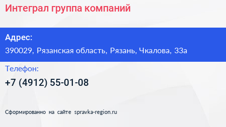 Интеграл, группа компаний по адресу 390029, Рязанская область, Рязань, Чкалова, 33а в дальнейшем Организация, размещена в следующих категориях: