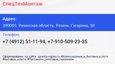 СпецТехМонтаж по адресу 390005, Рязанская область, Рязань, Гагарина, 18 в дальнейшем Организация, размещена в следующих категориях: