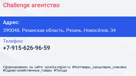 Challenge, агентство по адресу 390048, Рязанская область, Рязань, Новосёлов, 34 в дальнейшем Организация, размещена в следующих категориях: