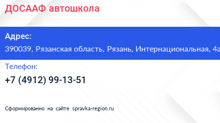 ДОСААФ, автошкола по адресу 390039, Рязанская область, Рязань, Интернациональная, 4а в дальнейшем Организация, размещена в следующих категориях: