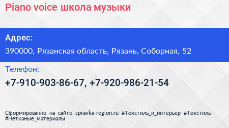 Piano voice, школа музыки по адресу 390000, Рязанская область, Рязань, Соборная, 52 в дальнейшем Организация, размещена в следующих категориях: