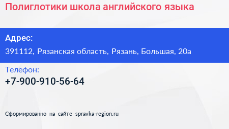 Полиглотики, школа английского языка по адресу 391112, Рязанская область, Рязань, Большая, 20а в дальнейшем Организация, размещена в следующих категориях: