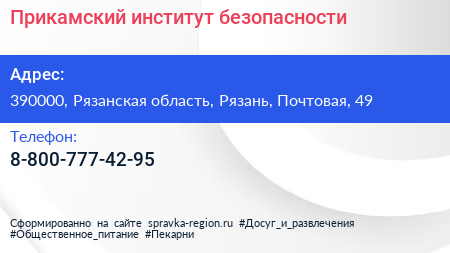 Прикамский институт безопасности по адресу 390000, Рязанская область, Рязань, Почтовая, 49 в дальнейшем Организация, размещена в следующих категориях: