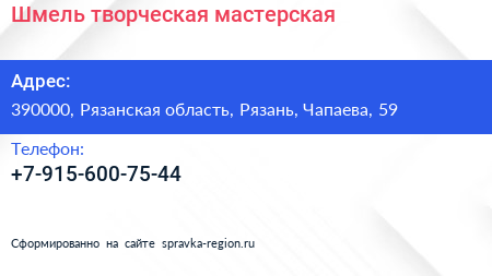 Шмель, творческая мастерская по адресу 390000, Рязанская область, Рязань, Чапаева, 59 в дальнейшем Организация, размещена в следующих категориях: