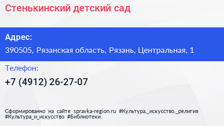 Стенькинский детский сад по адресу 390505, Рязанская область, Рязань, Центральная, 1 в дальнейшем Организация, размещена в следующих категориях: