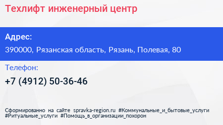 Техлифт, инженерный центр по адресу 390000, Рязанская область, Рязань, Полевая, 80 в дальнейшем Организация, размещена в следующих категориях: