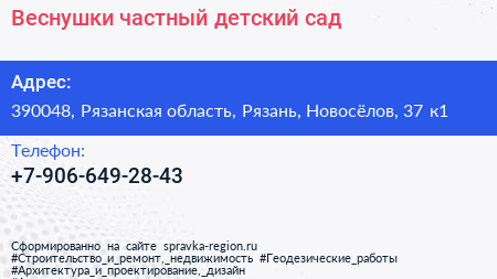 Веснушки, частный детский сад по адресу 390048, Рязанская область, Рязань, Новосёлов, 37 к1 в дальнейшем Организация, размещена в следующих категориях: