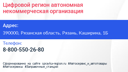 Цифровой регион, автономная некоммерческая организация по адресу 390000, Рязанская область, Рязань, Каширина, 1Б в дальнейшем Организация, размещена в следующих категориях:
