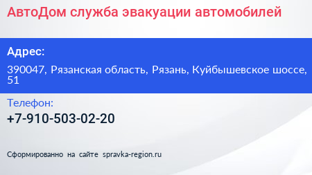 АвтоДом, служба эвакуации автомобилей по адресу 390047, Рязанская область, Рязань, Куйбышевское шоссе, 51 в дальнейшем Организация, размещена в следующих категориях: