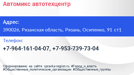 Автомикс, автотехцентр по адресу 390026, Рязанская область, Рязань, Осипенко, 91 ст1 в дальнейшем Организация, размещена в следующих категориях: