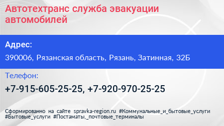 Автотехтранс, служба эвакуации автомобилей по адресу 390006, Рязанская область, Рязань, Затинная, 32Б в дальнейшем Организация, размещена в следующих категориях: