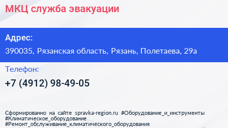 МКЦ, служба эвакуации по адресу 390035, Рязанская область, Рязань, Полетаева, 29а в дальнейшем Организация, размещена в следующих категориях: