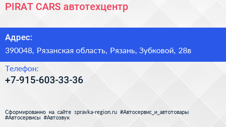 PIRAT CARS, автотехцентр по адресу 390048, Рязанская область, Рязань, Зубковой, 28в в дальнейшем Организация, размещена в следующих категориях: