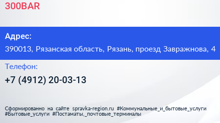 300BAR по адресу 390013, Рязанская область, Рязань, проезд Завражнова, 4 в дальнейшем Организация, размещена в следующих категориях: