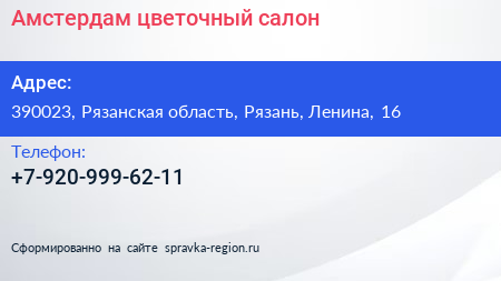 Амстердам, цветочный салон по адресу 390023, Рязанская область, Рязань, Ленина, 16 в дальнейшем Организация, размещена в следующих категориях: