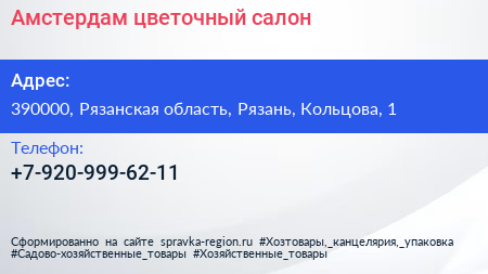 Амстердам, цветочный салон по адресу 390000, Рязанская область, Рязань, Кольцова, 1 в дальнейшем Организация, размещена в следующих категориях: