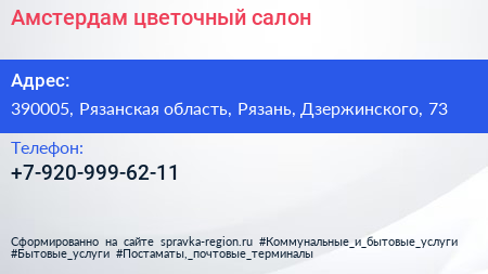 Амстердам, цветочный салон по адресу 390005, Рязанская область, Рязань, Дзержинского, 73 в дальнейшем Организация, размещена в следующих категориях: